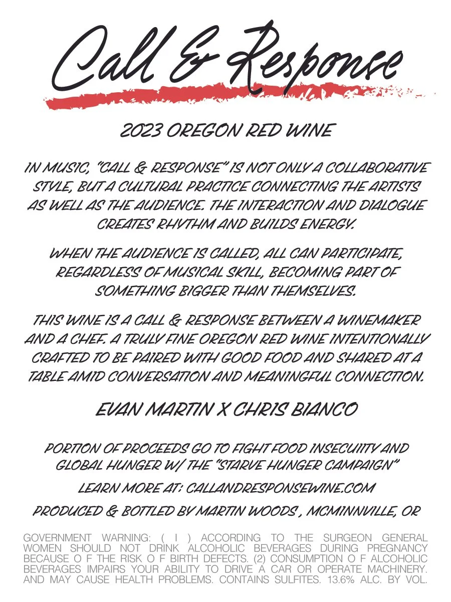 In music, "Call & Response" is not only a collaborative style, but a cultural practice connecting the artists as well as the audience. The interaction and dialogue creates rhythm and build energy. When the audience is called, all can participate, regardless of musical skill, becoming part of something bigger than themselves. This wine is a “Call & Response” between a winemaker and a chef.